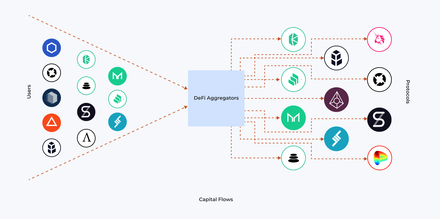 Decentralized finance (DeFi) aggregators are tools that assemble decentralized applications (dApps) to help investors navigate them easily through one interface.